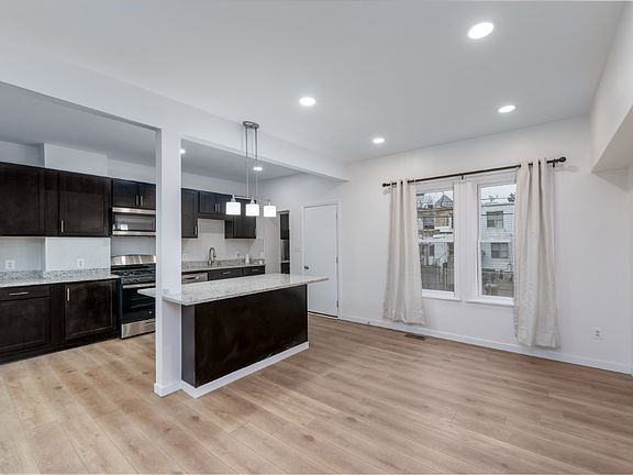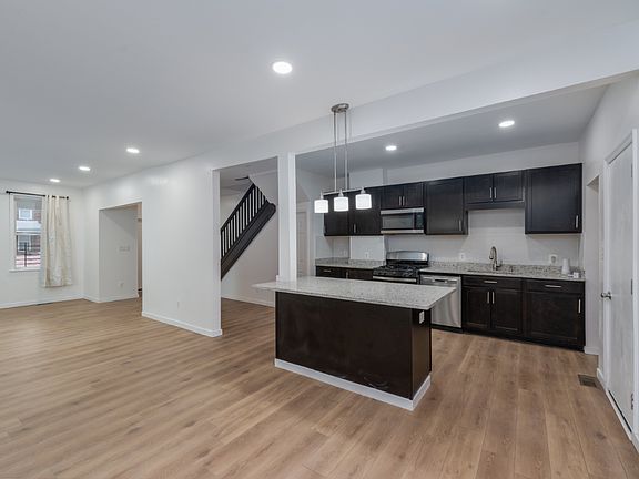 The open floor plan is enhanced by recessed lighting and an abundance of natural light, creating a bright and airy atmosphere. The heart of the home is the stunning kitchen, featuring a large island with ample cabinetry, eye-catching designer pendant lights, a sleek backsplash, and stainless-steel appliances including a four-burner gas stove, built-in microwave, dishwasher, and refrigerator.