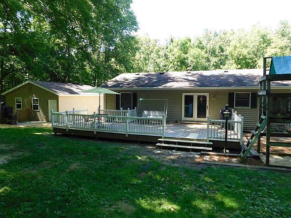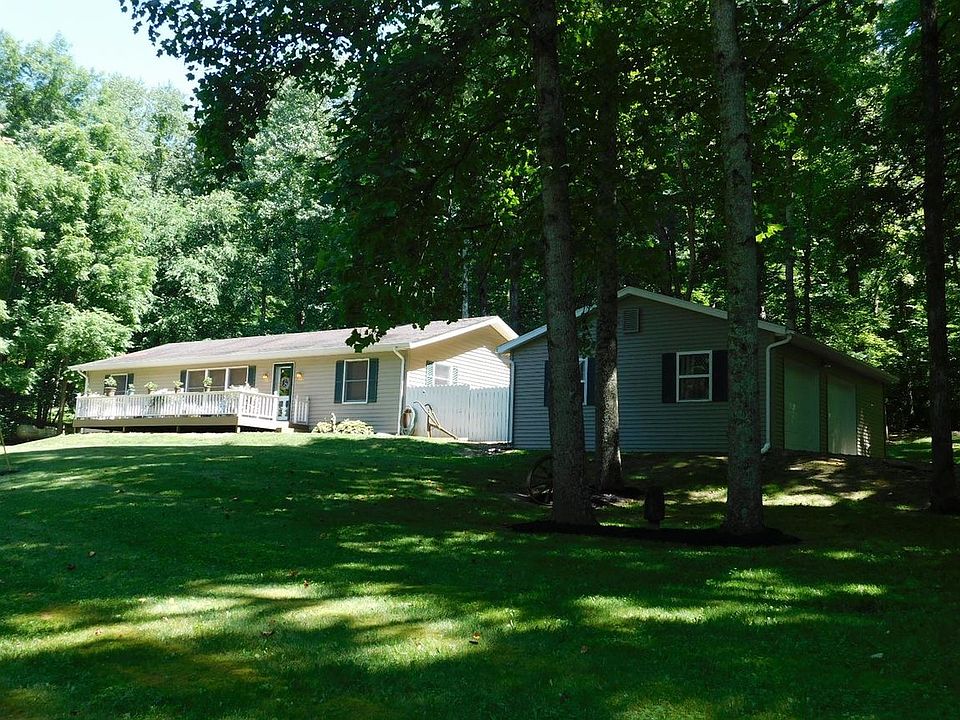 1540 sq ft 3 bedroom 2 bath ranch on wooded acre. Features a split floor-plan,large eat-in kitchen with custom cabinets, island bar, and walkout to back deck. Also, a first floor laundry room, master suite with walk-in closet, a partially finished basement and attached built in garage. Exterior features oversized front porch and rear deck, fenced in yard and a detached garage.