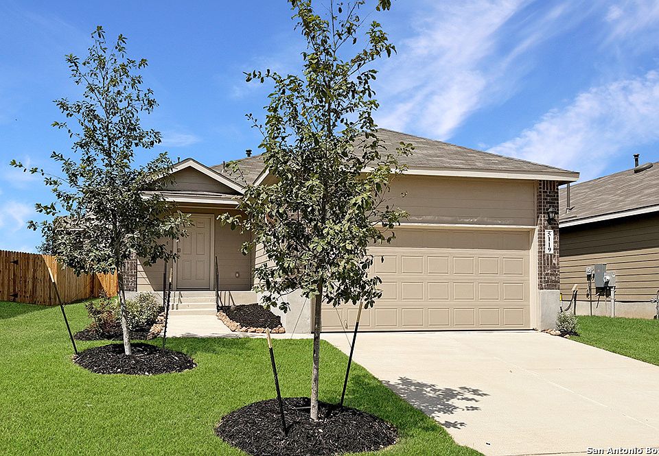The Estero is a charming one-story home featured in Langdon in San Antonio, TX. Featuring 2 classic front exteriors, this 4 bedroom, 2 bathroom home also offers 1586 square feet of living space and a 2-car garage. A front porch (per plan) welcomes you into the home and opens to the gourmet kitchen which includes quartz counter tops, shaker style cabinets, stainless steel appliances and an open concept floorplan with the kitchen flowing seamlessly into the dining room and living room. The main bedroom has an attractive ensuite bathroom that features a quartz vanity countertop, shaker style cabinetry and a spacious tiled walk-in shower. Enjoy additional storage with a large walk-in closet in the primary bedroom. Your secondary bedrooms all feature quality carpet flooring and a closet, and can be used as bedrooms, offices, work out spaces or other bonus rooms. The possibilities are endless with The Estero floor plan. Additional features include sheet vinyl flooring in entry, living room, and all wet areas, quartz counter tops in all bathrooms and HOME IS CONNECTED base package. Using one central hub that talks to all the devices in your home, you can control the lights, thermostat and locks, all from your cellular device.