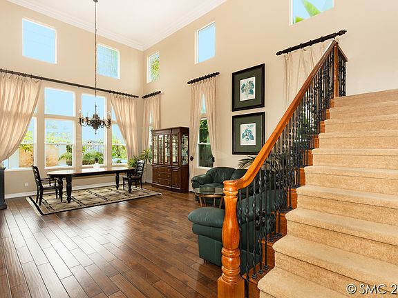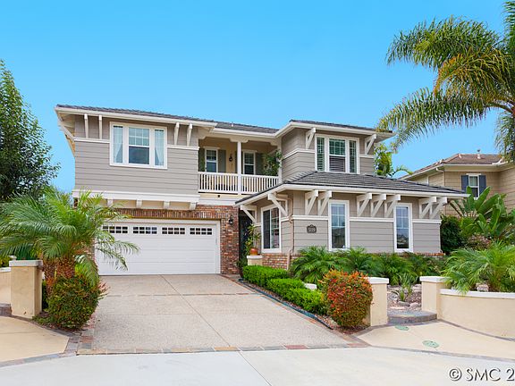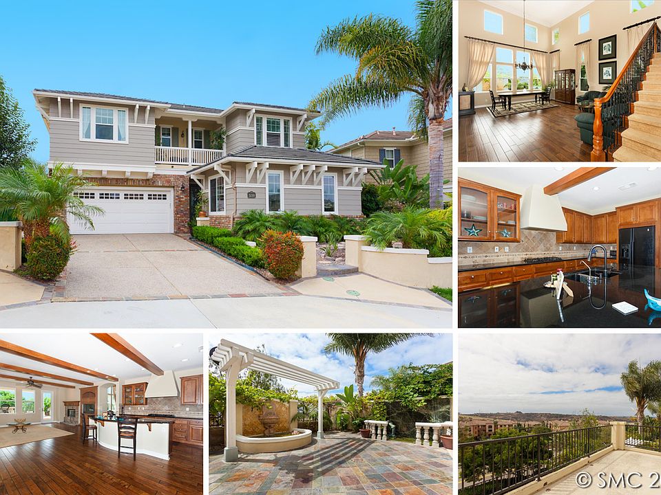 Come home to a Stunning Beach House with Ocean & Lagoon Views. Close to I-5, shops, and our wonderful beaches. 5Br, 3.5Ba, 3367 ESF, open layout offering privacy and serenity. This immaculate former Model Home in a cul-de-sac is high on a hill offering majestic views of the lagoon and ocean from upstairs and down. Lots of upgrades: Beautiful hardwood floor, 2 master suites (1 up + 1 down), gorgeous wrought iron stair railing, custom tile work, tons of storage, private deck with views and over $100K on backyard hardscaping for easy maintenance, including BBQ and 2 exquisite water features! The kitchen includes an island with seating, rich wood cabinetry, breakfast space and custom backsplash. Upstairs Master features a private deck with a view of Coastal Carlsbad, roman style tub, walk-in shower, vanity, dual sinks and custom floor tile. Very distinctive property in an exceptional location. Close to I-5, beaches & shopping. Low HOA in the much desired Carlsbad School District.