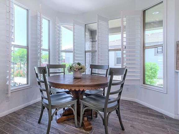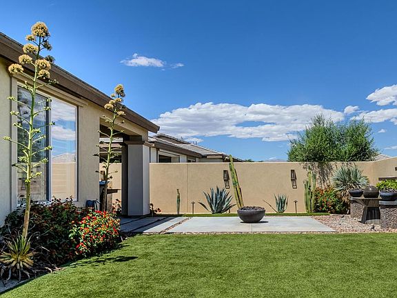 Turnkey Furnished and exquisitely finished. Designed for seamless indoor and outdoor entertaining, experience resort style living at Trilogy Polo! Modern day upgrades, from elegant porcelain wood plank tile flooring to bespoke wall shelves, plantation shutters & motorized solar shades covering the windows. Spaces are illuminated with custom lighting fixtures setting a perfect ambiance. A dreamy gourmet kitchen, with inviting morning room & view centric windows, features stainless steel appliances, a rich custom tile backsplash, & expansive quartz countertops surrounded by a grand island and breakfast bar. Split bedroom plan offers the guest suite as its own suite across the home adjacent to the kitchen. Retreat to the sumptious primary suite, with a custom tiled shower, dual vanities, oversized framed mirror, & a spacious walk-in closet. The living area is expanded outdoors with glass doors leading to a covered patio, complete with sconces illuminating a stucco block wall enveloping the backyard oasis. Lounge amidst lush artificial turf & effortlessly maintained desert landscaping. Gather around the fire water features, basking in the tranquil and celestial atmosphere. Trilogy at the Polo Club offers an array of amenities, including fitness & vibrant events. Delectable dining options at June Hill restaurant or casual fare at The Marketplace, featuring a breakfast & lunch cafe alongside a convenient market section. This is the epitome of luxurious desert livin