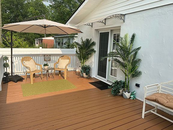 This home has 3 bedrooms and 1 master bedroom with a large bathroom and a hall bathroom. An office and a large deck with a top covering half of the desk.