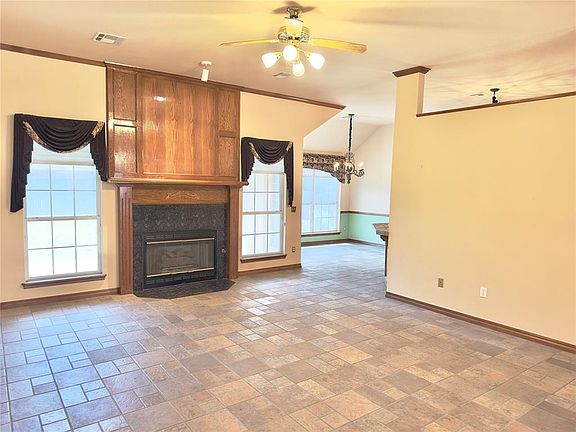 Great Location! This well maintained 3 Bed, 2 Bath home in sought after Cambridge Addition has spacious open living area with gas log fireplace, and tile flooring. Kitchen has generous dining area, tile counters, pantry and refrigerator. Primary Bedroom is separate, and has laminate flooring, private bath with deep tub, separate shower, and large walk-in closet. Secondary bedrooms are good-sized and have laminate flooring. Large backyard, and covered patio. This West Norman neighborhood also has winding streets lined with mature trees, providing welcome shade on these hot summer days, private stocked lake, playground, and walking trails. All this, plus close to restaurants, shops & Sooner Mall. Must see this one soon!