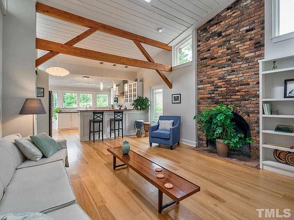 A beautifully renovated and reimagined home. Relish the charm of 1950's architecture with the function, form and finishes of today's highest standards. All set on 2 acres of unparalleled bucolic bliss! Rolling meadows, Neville Creek, old growth trees, and expansive flowering gardens. Inside, enjoy soaring ceilings with exposed beams, rich hardwood flooring, and walls of windows to showcase the pastoral grounds. Large and light-filled living spaces are flexible in design and use. Just 6.4 miles to UNC!
