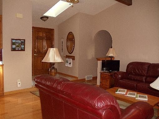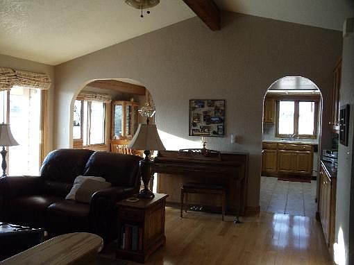 Mountain Views, Quiet Country Home, nestled at the top of a cul-d-sac, this 2,633 sf home has been updated. Kitchen features tile floors & counters, stainless appliances, custom cabinets & hutch. The dramatic entrance opens to wood floors, vaulted ceilings, skylights, rock fireplace, then on to the formal dining area. Double doors open to the patio & deck affording views of mountains and the ridng trail.The home has a new 50 year steel roof, 2 car garage and an oversized 1,151 square foot utility building with a high door for rv parking.