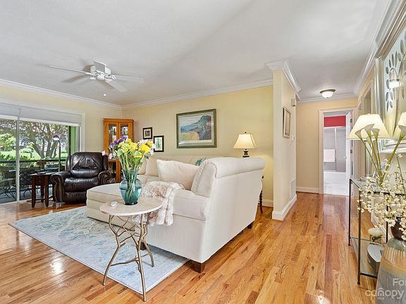 Enjoy living in a highly coveted community, known for its walking trails, clubhouse, outdoor heated pool, lake, and its engaged community. This end-unit home has 3 bedrooms and 2 bathrooms, all on one level. Hardwood floors, crown molding, and lots of light give this home warmth and comfort year-round. Kitchen has granite countertops, a tile backsplash, and stainless steel appliances, along with an eat-in breakfast nook. Dining room has ample space for a table and sideboard for entertaining. The living room is spacious and feels even more expansive, thanks to the adjoining screened-in patio. Large primary bedroom has an ensuite bathroom and walk-in closet. Bedrooms have carpeting, ceiling fans, and good-sized closets. Bathrooms have shower/tub combination with tile on walls and floors. Courtyard, off the kitchen, is the perfect place to grill. Washer and dryer convey, and don’t miss the extra storage space in attic! Furnishings are negotiable to make this a turnkey purchase.