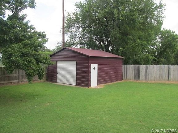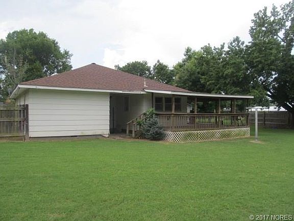 3 bedroom home in Weleetka. Right Next to Football Field, fenced yard w/workshop and storage building. CH/A, nice living area, formal dining, nice kitchen, covered deck, patio & porch. Located on a dead end, nice location.