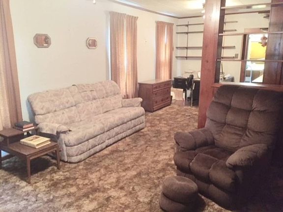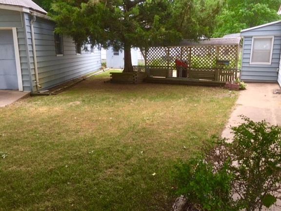 Entrance: Glassed in front porch with carpet opens to Living room. Large open space which can be living room/dining room combo. Carpet, thermopane windows, cream colored walls and carpet. Kitchen: L shaped cabinets. Stove and refrigerator included. Paneled walls, vinyl floor Back porch: Carpet, glass windows, paneled walls, this porch is a three season room. Opens to laundry. Laundry: Washer and dryer included. Lots of space and back door exit. Bath: Fully redone! Step in tub with jets. New vinyl floor. Master Bedroom: This area was formerly 2 bedrooms, opened up to make one large MBR. Light paneled walls, brown carpet, closet Upstairs: Small entrance room with closets and carpet. Second bedroom has paneled walls, carpet. Basement: Insulated walls for this large basement. Can be made into more bedrooms. Pool table, high efficiency furnace and CAC. Gas water heater. Yard is the focal point! Fully fenced lot and 2 car garage to north across alley is included. Yard adjacent to house has another 2 car garage plus storage room. Patio area with shade or sun. Exterior has siding, thermopane windows, shingle roof. Close to stores and shopping.