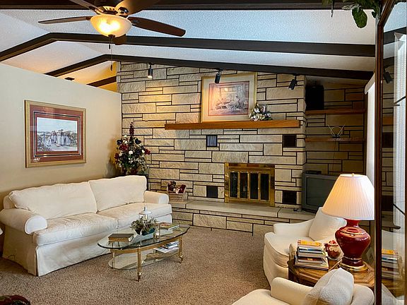 Here is a beautiful ranch style home in Goodland, KS. This home features lots of extras including a half-circle drive, attached and detached garage, additional garden shed, and a unique stone exterior to name a few. Approaching the home you will find a covered porch perfect for morning coffee as the sun rises. Inside the home you will enjoy vaulted ceiling over the family room accented by the natural light provided by the bay window and warmed by the fireplace. This room flows into the dining area that offer vinyl floors that extend through the kitchen and laundry rooms. The kitchen includes unique features with tiled backsplash, plate warmer, and island with power source. Ample cabinetry along with double oven make preparation for holiday meals or weeknight dinners readily available. The laundry room presents good size for your craft and project needs with additional cabinets. Access to your attached garage as well as covered back patio are available here as well. Completing this room is a well-positioned half-bath for convenient use between the kitchen, laundry, and BBQs in the backyard. Three bedrooms are located on the main floor including the master suite. The master offers warm colors with walk-in shower. Dual closets for your styling needs as well as two windows for those summer evening breeze opportunities complete the master bedroom. Two additional bedrooms are located on this wing of the house as well as a full bath to service the two bedrooms. Downstairs you will find an additional living space heated by a second fireplace. A valuable storage room is located just off the living space. A full bath is located in the basement to compliment an additional non-conforming bedroom or recreational area. Outside the home you will enjoy underground sprinklers throughout the lawn. The backyard offers a privacy fence with access to your garden shed as well as detached workshop. This workshop is a tremendous assent and is designed to match the material of the home. This property is ready to call home to a new buyer. Contact us to tour the property!