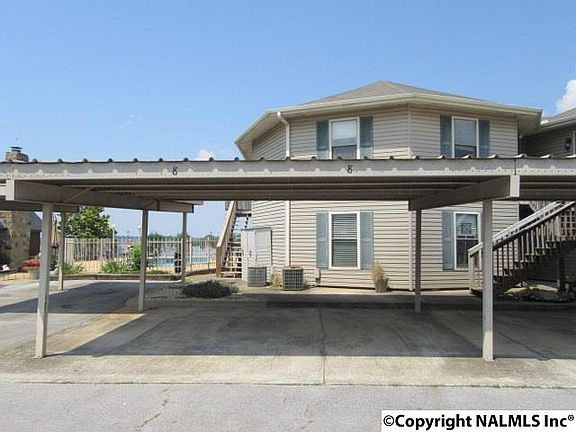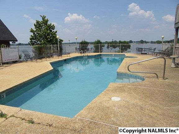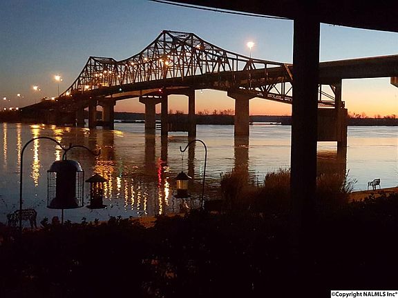 Water Front Living just 90 minutes to Birmingham or Nashville, 25 minutes to Huntsville! You will love the water & TN river bridge view from this updated unique condo in New Town Landing! Modern open floorplan condo with spacious & studio style layout featuring stained concrete floors, living room opens to dining & kitchen. Kitchen features built-in wine cooler/bar area, tile back splash & stainless appliances. Updated bath with beautiful marble floors, deep soaking tub, separate shower with stone/tile details & modern glass double sink vanity. Covered porch to relax & enjoy the water views. Covered carport 2 car parking. Storage Bldg. Community Pool, yard maintenance & more!