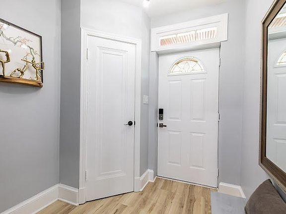 As you enter, you'll find an inviting lobby with a stunning mirror a perfect touch to check your appearance before heading out. Gorgeous 7-inch wide wood plank flooring flows throughout the living, dining, and kitchen areas. The main level features a gourmet kitchen equipped with stainless steel appliances, dark cabinets, a built-in microwave over an electric range, a dishwasher, and a refrigerator.