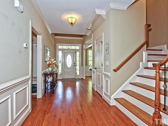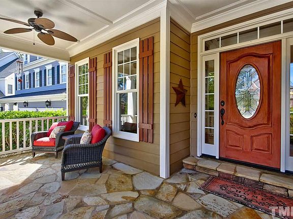 CLASSICALLY styled, CUSTOM finishes and CONVENIENTLY located in West Cary-a winning combination! Flexible floor plan-5 beds/4 full baths, Huge front porch with beautiful stone flooring overlooking cul-de-sac and pond with fountain, Gourmet kitchen (refrigerator included), hardwood flooring thru first floor and stairs (except 1st floor bedroom), abundant walk up storage, walk to Highcroft Elementary, Sears Farm Park/community pool, FENCED yard backs to woods, custom built-ins and trim.