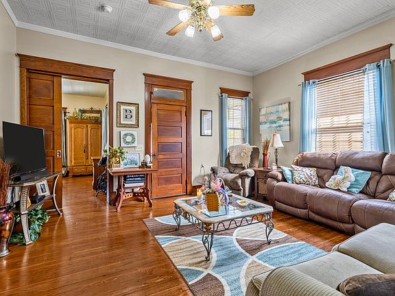 Step back in time to one of Monett's rare finds: a beautiful carthage stone home, masterfully balanced with restoration and upgrades. Transom windows, pocket doors, and wood flooring evoke the charm of yesteryear. The current owner invested countless hours painstakingly working to make this treasure shine. The front porch is a grand feature and from the moment you enter, you'll feel the uniqueness of this place. The vestibule entry remains intact. The owner, with a keen eye, recognized the importance of a large kitchen/dining space and designed a perfect blend of primitive yet modern elements, including a double oven, marble tile, countertops, and handmade cabinetry, lovingly crafted by them. The primary bedroom is on the main floor, along with a bath and utility room. A pass-through office area offers ample display and work space, featuring a vintage stained glass transom as a nod to the past. The owner added the upstairs, which includes three generously sized bedrooms with spacious closets, a full bath, and a family room area. There is a small storage and mechanical room basement, and the detached garage, once a carriage house, has been transformed into an ideal auxiliary space or out-of-the-home office. This completes the property, perfect for guests, an office, or a hobby room. Opportunities to own such a beauty are rare.