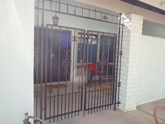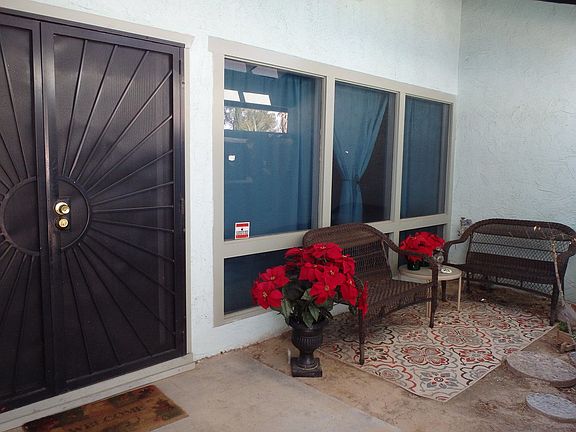 Minimum care front yard opens thru iron entry gates to private outdoor patio. Double doors lead to tiled reception area.To left is large carpeted sunken living rm w/cathedral ceiling:track lites & 2 skylites.To right is formal dining rm w/chandelier & windows to front patio.Kitchen open:solid surface counters w/integrated sink.DW & double oven 3 yrs old.Electric cooktop & hood;tiled floor & lots of cabinets,Breakfast bar open to family rm featuring fireplace w/gas flanked by builtin bookcases.To the left is sun rm w/custom tiled floor to view pool and dine.Kidney shape gunite pool is fenced; 8' to 3' deep;steps on west end;maintained by Ross Menzel.Diving bd '13.River rock border.Jacuzzi on east side:new gasline to be installed in escrow.No grass!Lge covered concrete patio for bbq;block wall on south & west.Grd mt cooler shaded. Dog run.Back inside huge mstr suite is on east side: mirrored wall of closets.Mstr bath has 2 sinks & mirrors;stall shower &cabinets.On west side of house are 2 spacious guest bedrms & full bath in between.Fans in all bedrms.Vinyl flooring in oversized finished garage;sink & laundry. RV hookup w/sewer connection. Newer roof. No hallways!