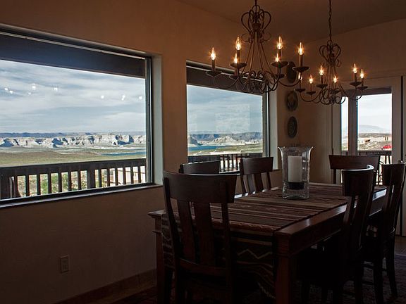 REDUCED! Unobstructed, protected views of Lake Powell are just part of this wonderful custom 3 bedroom, 2.5 bath, home in Greenehaven. Quality everywhere you look from the quartz counters, to the raised dishwasher, in wall double ovens with chefs gas cooktop. The kitchen and dining room open out to the wrap around deck with views of Lake Powell, Navajo Mountain, Glen Canyon, and the Grand Staircase. Split floor plan includes a lovely master with a private sitting room and stunning bath featuring a Jacuzzi jetted heated tub and a tile shower. An oversized 2 car garage includes a work space with evap cooler. On the garage level are 2 great spaces to use as a craft room, storage area, game room, or other options. The front is fully landscaped and the back is a blank canvas waiting for your personal touch. Greenehaven is a Dark-Sky community, perfect for stargazing ~ come see what all the fuss is about!