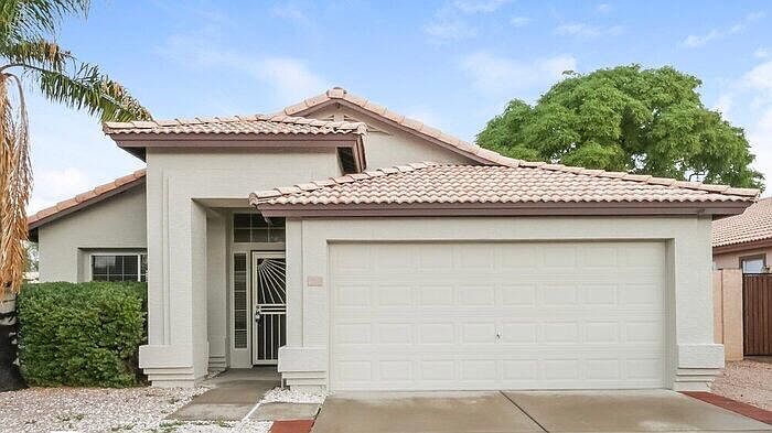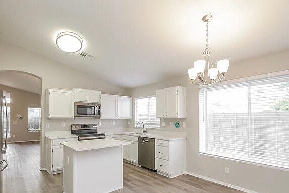 Check out this cute three-bedroom, two-bath rental home in Mesa, Arizona. It has a two-car attached garage. Come into the first living area, which could be your living room and dining room combination. The vaulted ceilings are lovely and there's lots of natural light. There is a pretty chandelier in the dining area and a wall nook nearby. The kitchen is amazing. It has beautiful white cabinetry and stunning quartz countertops. You'll be happy to find stainless steel appliances, a kitchen island, and a pantry, too! The main bedroom has a large walk-in closet. There are dual vanity sinks and a private water closet in the attached bath. In the fenced backyard is a covered patio. Pets welcome! Come tour today.