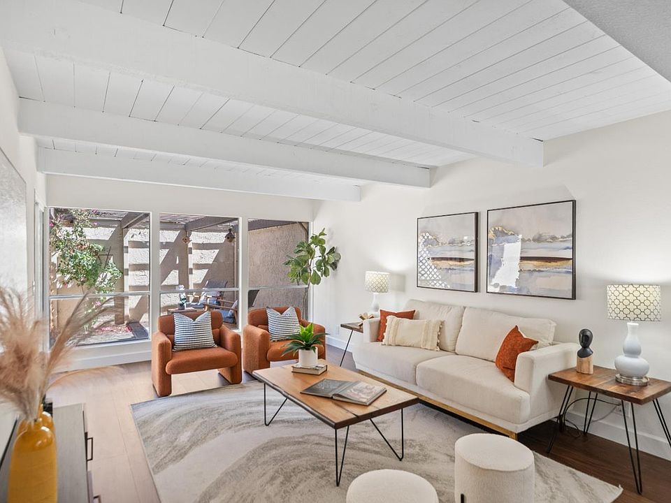 Spacious home with large wrap-around yard, perfect for entertaining & just 2 mi to Apple Spaceship Campus! Fantastic location means students have access to excellent Cupertino schools: 2025 California Distinguished School Nimitz Elementary, Top 100 California Middle School Cupertino Middle & highly-coveted Fremont High (buyer to verify)! Bright living room with nearly wall-to-wall windows & sliding door to backyard. Modern kitchen boasts new quartz counters with full backsplash & all new fixtures, cooktop, & oven with air fryer! En-suite primary bedroom with sitting area has 2 closets & second bedroom has private balcony. Generously-sized bonus loft with closet lets radiant sunlight beam throughout home. Or, convert it to a third bedroom (buyer to verify). All mirrored, full sized closet doors in bedrooms, loft, & upstairs hallway. Enjoy beautiful Bay Area weather in your private wrap-around courtyard for entertaining with low-maintenance design, trellis draped in stunning bougainvillea & mature trees! Plus, in-unit large laundry room, remodeled bathrooms, all new flooring, modern lighting, & 2 spacious one-car garages with storage. Situated 0.3 mi to Nimitz Elementary with play structures, athletic courts & sprawling lawn; close to large tech employers & high-end amenities!