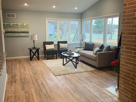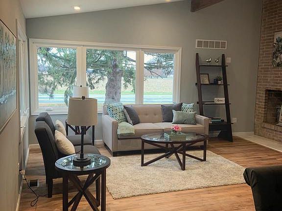 R-11141 Why wait for cookie cutter new construction in a development when you can move right in to this totally renovated 4 bedroom, three bath home on over one half acre with no HOA fees or oppressive restrictions?! This unique home is gorgeously decorated and includes a brick exterior, a basement, and a two car garage. Enjoy sweeping farm views from your living room and master bedroom. Enter on to the main floor which features a two-story foyer, open floor plan, abundant recessed lighting, hardwood floors throughout, vaulted ceilings with exposed beams, a large living room with a wood-burning fireplace, and a dining room. The spacious kitchen has plenty of cabinet and counter space, ceramic tile flooring, granite counter tops, and stainless appliances. A sunny three season room is located just off the dining room. Upstairs are three of the home~s four bedrooms, including the master suite with double bowl vanity and oversized shower with ceramic tile. All three bedrooms have hardwood flooring, and two of the bedrooms have large walk-in closets. Second full bath on this floor has double bowl vanities, a separate water closet, tiled floors, and a shower/tub combo. Half a story down from main floor (but still above grade) is the second master suite with full bath room. This would make the perfect guest or in-law suite with its private location away from the other bedrooms and easy exterior access. Also on this floor is the huge mud room at the garage entrance which is plumbed for a laundry sink next to the washer and dryer, and has a convenient laundry chute from the second floor. Entire lower level has luxury vinyl tile flooring. New HVAC, new roof, and new Pella~ windows. 100% USDA financing available for qualified buyers.