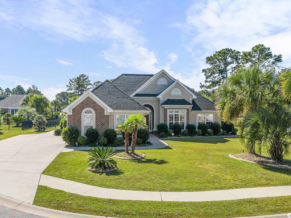 Nestled in the highly desirable gated community of Covington Lake East in Carolina Forest, this custom-built 3-bedroom, 2-bath home is a true masterpiece. Situated on a peaceful cul-de-sac, this all-brick home with stucco accents and a side load entry garage exudes timeless elegance. Inside, you'll find a separate dining area with a tray ceiling, a spacious living room with vaulted ceilings, a cozy fireplace, and crown molding throughout. The rounded corners throughout the house add a touch of sophistication. The outdoor space is a true oasis, boasting a fenced backyard with three gates for easy access to the pond, lush landscaping with abundant palm trees, decorative concrete landscape curbing , and a screened porch with tile flooring. The owner's suite is a retreat with an incredible frameless shower door, marble tile shower, a tray ceiling, and a generous walk-in closet. Modern comforts include an irrigation system, high doors, high baseboards, and luxury vinyl plank flooring throughout. With a brand-new roof, a finished garage featuring an epoxy floor and built-in workbench, this home is both stylish and functional. The kitchen is a chef's delight, featuring granite countertops, beautiful high cabinets with crown molding, and some cabinets with elegant glass doors. Don't miss the opportunity to make this dream home yours. Covington Lake East is a welcoming community where neighbors frequently gather for walks, bike rides, and leisurely swims at the nearby community pool, just a short stroll from this splendid home. This small community offers the advantages of sidewalks, wide roads, spacious homesites, and proximity to shopping, dining, medical facilities, and hospitals. Discover the pinnacle of modern living in this remarkable property, and make it your new home today