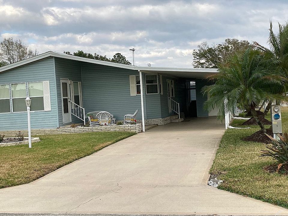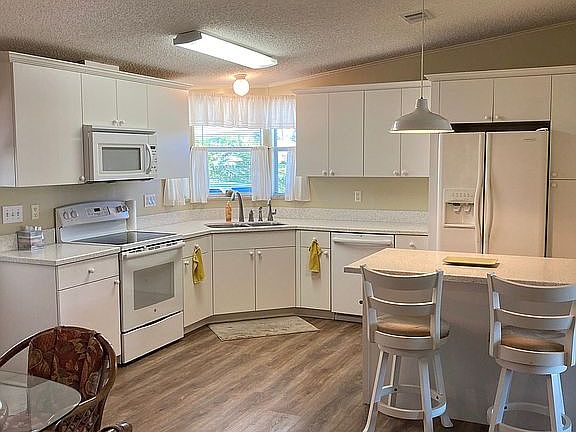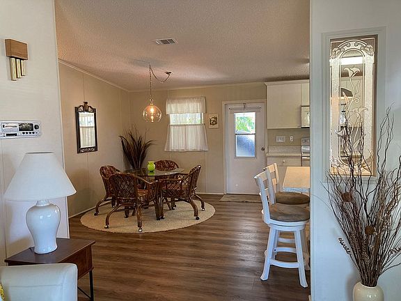 This home is move in ready. You enter into a completely remodeled kitchen with custom cabinets with Corion counter tops and plenty of storage space. All appliances include; refrigerator, range, dishwasher, over the range microwave. A stainless steel sink and reverse osmosis water filtration system. The dining room is open to kitchen and living room. The Florida room is an extension of the living room with plenty of natural light. The laundry room has newer washer and dryer and plenty of storage. The main bedroom is spacious with double closets, with the main bath has a double shower and vanity. The second bedroom has single closet. The second bath has tub and shower combination with vanity. The new laminated vinyl flooring was installed throughout the home with tile in both bathrooms. The composition roofing was put on in 2019. There is a Utility shed with built in shelving and countertop and more storage. There is a screen patio in the back and an open patio in the front. There is a long driveway of which 37' covered. There is a separate well for irrigation for the lawn. New water heater. This home has been very well maintained and has been a winter home for over 21 years with the same owner. This home is mostly furnished.