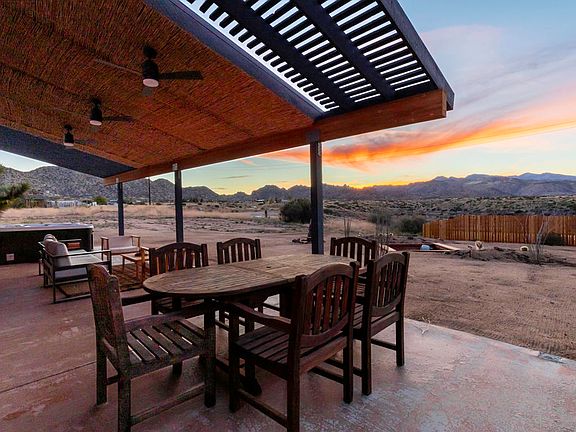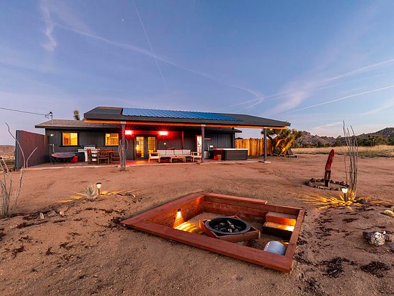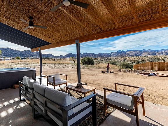 Turn-key home with panoramic Top 10 desert views overlooking thousands of acres of conservancy open space land. Beautifully remodeled with designer finishes throughout. 1.26 acres on a quiet street in the most sought after zipcode of the Morongo Basin. Pioneertown is known for its multi-million dollar celebrity hideaways, gorgeous natural aesthetics, and its old Hollywood charm. Property features a 2 bedroom 1 bath home with bedrooms on opposite sides. A desert garden encompases the entrance way to the front door. Step into the living room with colored concrete floors, mini split hvac, gallery wall, and views from every window. Pendant hanging lamp anchors the dining area. Kitchen boasts long counters, cabinets, cupboards, refrigerator, dishwasher, stove, and dual basin sink. Each bedroom has a large mirrored closet. Bathroom with shower, tub and vanity. Glass french doors open to an expansive shaded concrete patio, with ceiling fans, lounge area, dining area, and spa. Sunken fire pit to entertain friends under the stars. This is by far one of the superior lots in Pioneertown. Ample parking and a shipping container for desert toys. Just down the street is the legendary venue Pappy & Harriet's. Also in the western town is the Red Dog Saloon, Pioneertown Bowling alley and various shops. Short drive to all amenities in Yucca Valley. 28 minutes to the Joshua Tree National monument where about 3 million tourists visit annually. 45 minutes to Palm Springs. Schedule a tour today!