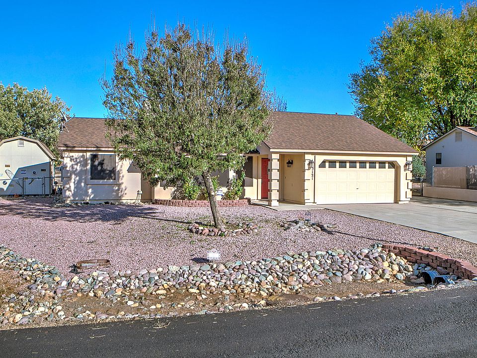 YOU CAN BE HOME FOR THE HOLIDAYS! This could be the best gift on your list. A beautiful open floor plan with a large bonus room to gather in with your friends & family. The large kitchen offers plenty of counter space, a gas range, pass thru windows to the bonus room and a large pantry. A warm cozy corner fireplace in the living room is waiting to be lit. The backyard is very private with a greenbelt that separates you from the neighbors. Views of the Mingus mountain range can be enjoyed from the patio. A large storage shed with electricity can serve as a great workshop or art studio. Additional concrete pad for RV/trailer parking on the side. Roof was replaced in 2016. Start packing and get ready to move in! Once settled, you will appreciate the hot tub after the move!