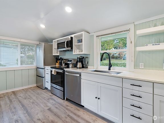 Beach Cottage Living in the heart of Birch Bay at Cottonwood Beach! West-facing views of the bay, mountains, and islands. One street up from the beach. Historic home with lots of light and character. Home has been recently updated with whole new kitchen (including cabinets, slab counter, and SS appliances), many windows replaced, flooring, fresh paint, and an expansive deck, perfect for outdoor living. 2 bedrooms / 1 bath, 1 car detached garage with laundry/utility room. Large yard with mature landscaping. Less than a mile to the town of Birch Bay. This cottage is currently utilized as a short-term rental with a strong rental history (additional information available upon request). Opportunity is knocking!