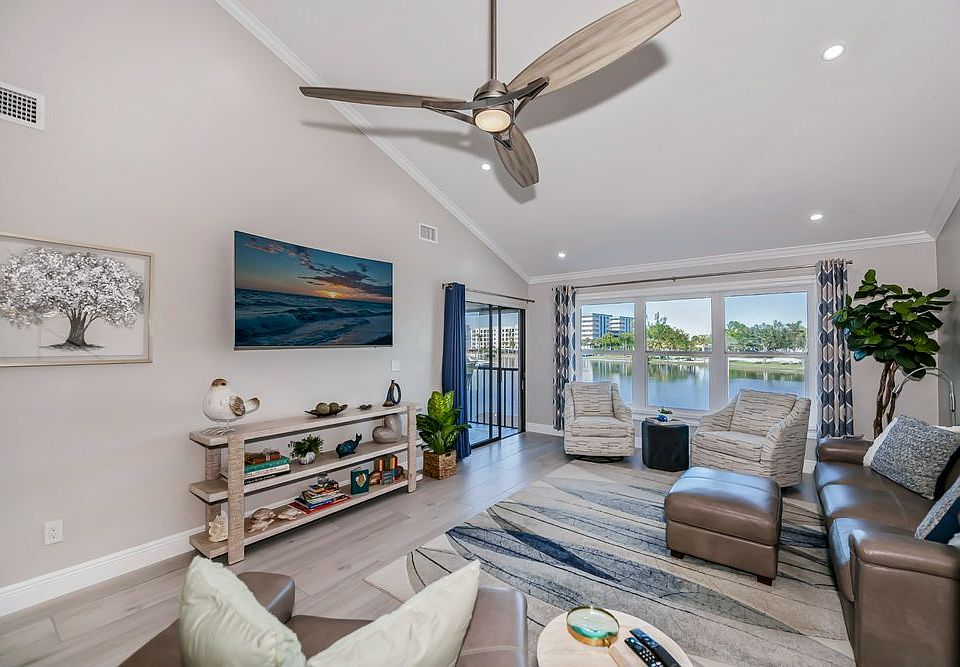 This is it - a gorgeous, entirely remodeled 2nd/top floor condo, located on sought after Bimini Basin with direct sailboat access to the Caloosahatchee River and the intra-coastal. Situated at the end of Sunnybrook Court in the Yacht Club District of SE Cape Coral, this 28-unit community boasts serenity and privacy galore! Oversized single stall garages greet you upon entry, equipped with an epoxy resin coated floor and an aluminum pull-down ladder leading into a raised, lighted attic offering loads of storage! WOW! Behold the luxurious sophistication of this remodel: waterfall edge porcelain countertops with an expansive 12' island at center, raised tongue and groove ceiling throughout the kitchen area, and a hidden Invisacook cooktop - a must see! In addition to the abundance of storage the beautiful cabinetry provides, open double bifold doors into a custom pantry. A roomy alcove just off the kitchen hosts another beverage cooler and more recessed cabinetry! An exquisitely designed unique hardwood floating staircase with braided stainless steel cable railings launches you into the spacious, inviting loft with a massive walk-in attic, overlooking the living room and owners boats on Sunnybrook's captains' docks! This remodel left no room untouched. Both bathrooms showcase floor to ceiling large shower tiles, and the primary bathroom was enlarged to accommodate an impeccable walk-in shower. End your day enjoying captivating sunset views from the lanai, protected by removeable screens and remote hurricane curtains.