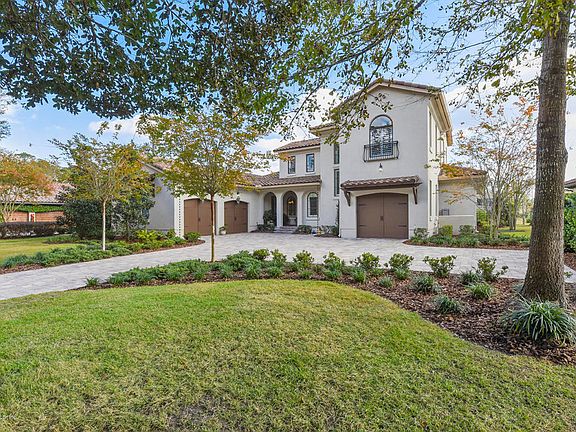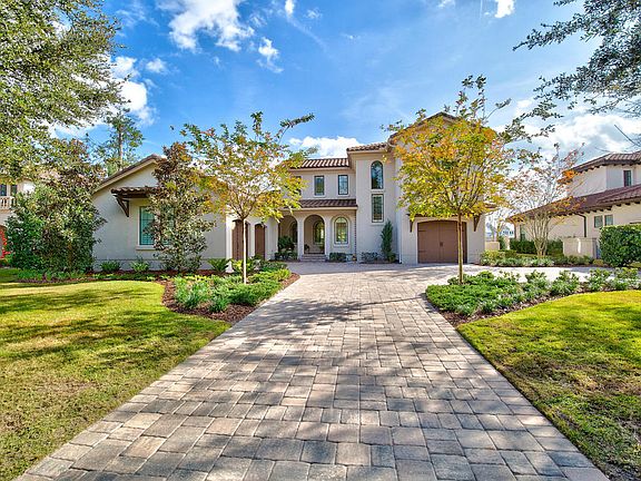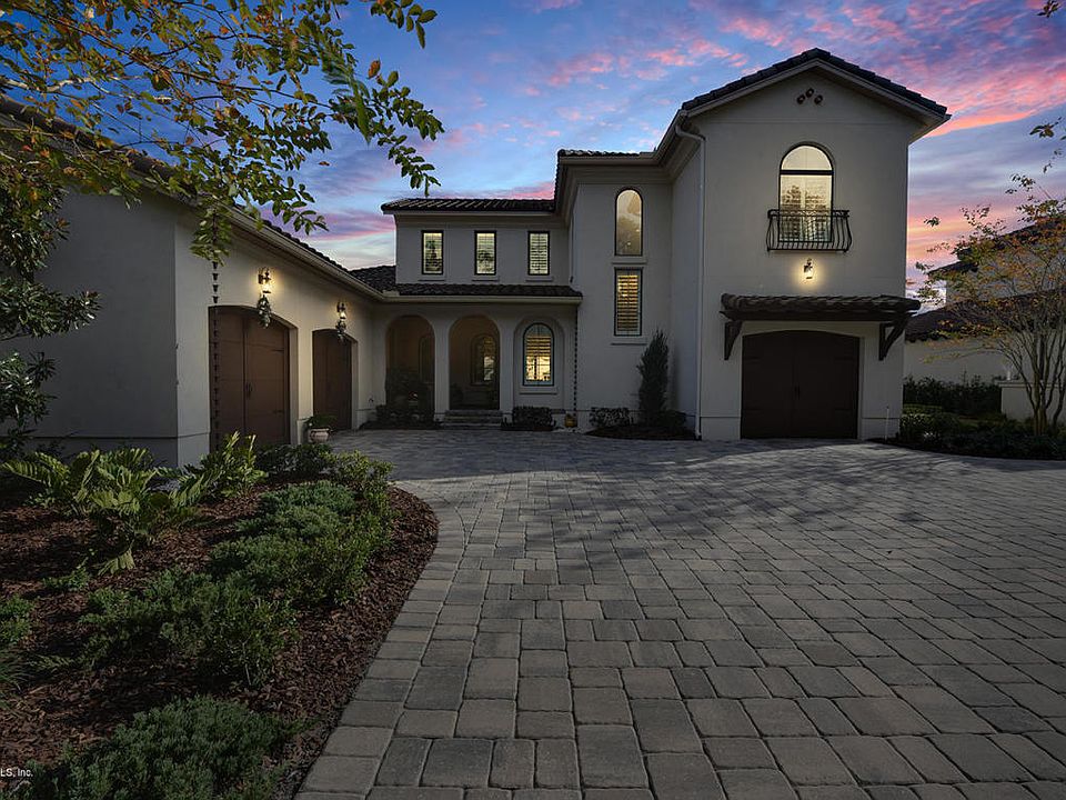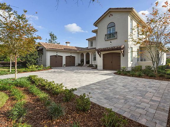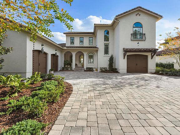 Timeless elegance best describes this modern Spanish Colonial style home. The quality and architectural features will impress you from the moment you walk in the front door! Home boasts gorgeous ceiling beams, wood floors throughout living space, two-sided fireplace that elegantly separates the great room and kitchen/dining area, w/ the beautiful owner's suite on the first floor! The kitchen is a chef's dream! Includes white shaker cabinets, large granite island, Thermador appliances, complete w/ butler's pantry. Breathtaking outdoor area offers covered lanai w/ saltwater pool, 5 hole putting green, and overlooks the peaceful lake with fountain! Audio Visual system & TV's included! Pablo Creek is a luxury gated community w/ park amenities. This home has great location close to culdesac!