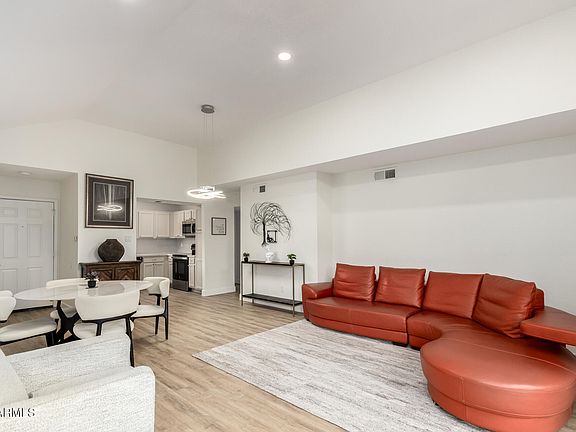 Sunlight, style, and Scottsdale sophistication—welcome home to Milano Terrace. Perfectly positioned beside Stonecreek Golf Course, this gated gem has been completely remodeled with refined finishes and effortless flow. Vaulted ceilings and designer lighting set the tone, while warm wood-style floors carry you through bright, open spaces made for both relaxation and entertaining. The kitchen impresses with stainless appliances, sleek cabinetry, and generous counters. The bedroom suite feels like a retreat with a beautifully updated bath. A private hall laundry room is tucked away for convenience. Enjoy mornings on your balcony, a swim in the pool, or a peaceful walk through the lush community paths. Optional showroom-condition furnishings make moving in feel like checking into luxury.