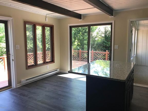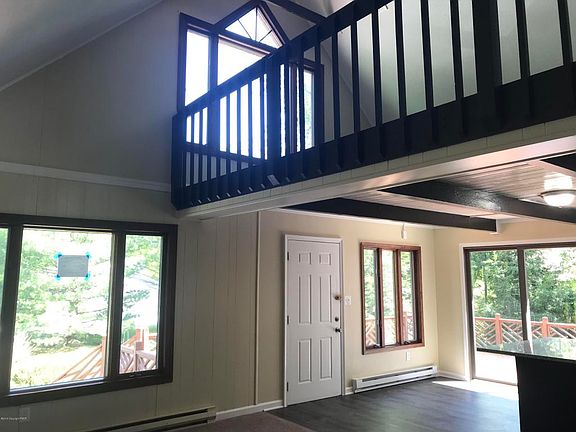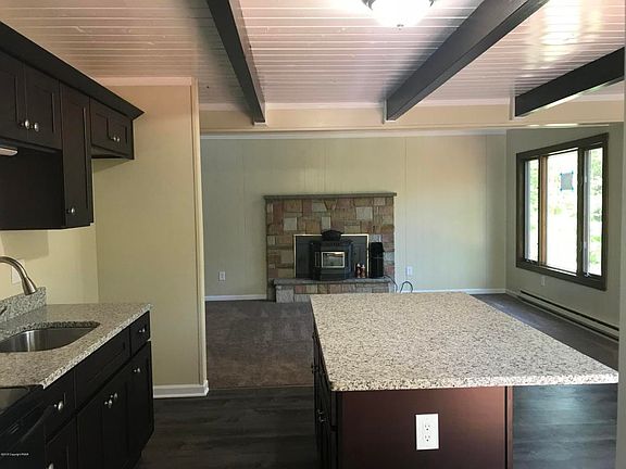 New Modern Kitchen w/Granite countertops, island & new laminate wood flooring, 2 new baths, freshly painted interior, Large enclosed Sun Room leads to wrap around deck perfect for ENTERTAINING! 3 Bedrooms plus large loft adds extra sleeping space. One Car Detached garage, shed & paved driveway CONVENIENTLY LOCATED JUST OFF Rte 611 and CLOSE to many Pocono Attractions, within Country Club community offering 18 hole Golf Course, Olympic size Pool, tennis, lake w/beach, Community Center w/restaurant, fitness center and MORE!