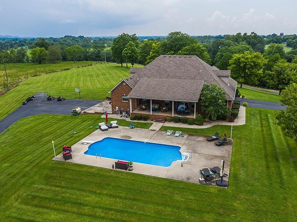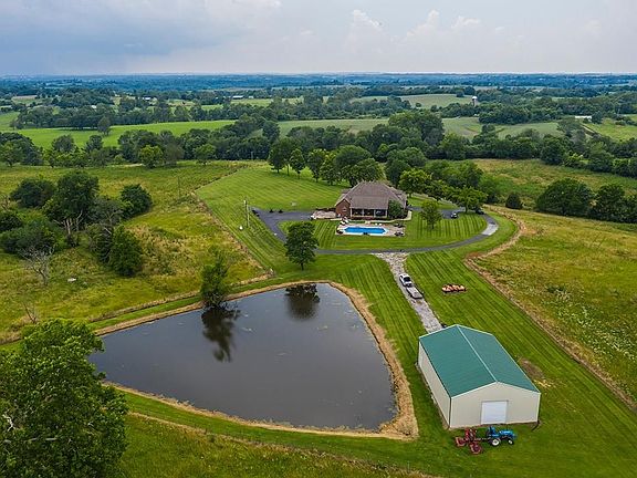 This beautiful home in a picturesque setting will make someone very lucky. Situated on 25 acres w/a 40'x 60' metal building w/concrete floors & a stocked pond (bass/catfish/crappie), this home is nearly 6000 finished square feet with an in ground pool & full basement. All hardwood and tile on the 1st and 2nd levels. You will be AMAZED at the size of the BDs (all w/walk in closets!). The master suite (26'7 x 16'9) feels very grand with its own private rock wall fireplace & large bathroom (13'x16'10) featuring double vanities w/a makeup vanity & jetted tub. Upstairs the 2 BRs (one could be a second master) are separated by an open concept den, perfect for a kids play room or teenage hangout. There is plenty of room in the finished basement too as well as an additional 3 car garage-complete w/an additional W/D hookup and sink. Outside, the covered patio overlooks a beautiful pool and the pond. Enjoy plenty of privacy-I don't think you can see a neighbor! Call today for a private tour!