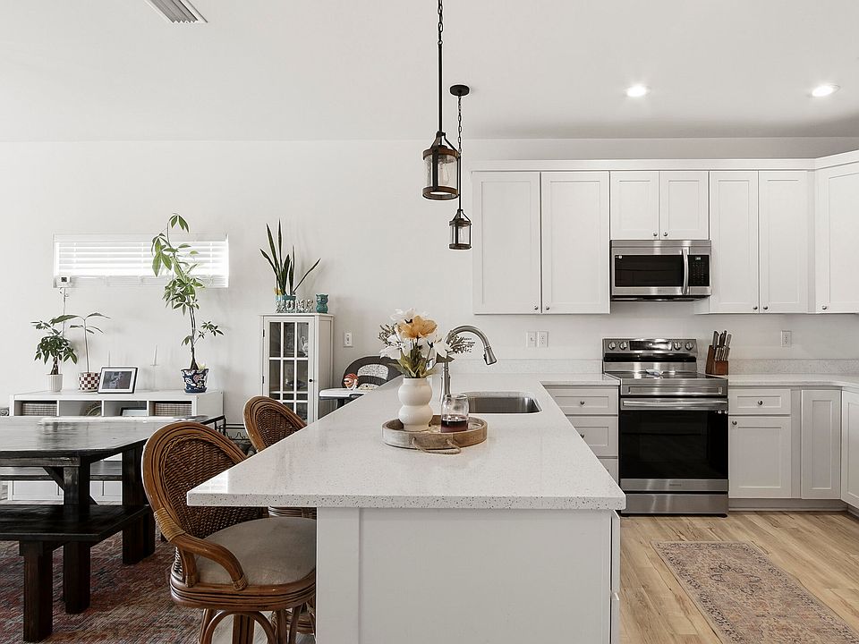 Step inside to a spacious open floor plan filled with natural light and upscale finishes. The kitchen is a showstopper with beautiful quartz countertops, a large island bar, stainless steel appliances, and white shaker cabinetry that make it ideal for both cooking and entertaining.