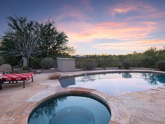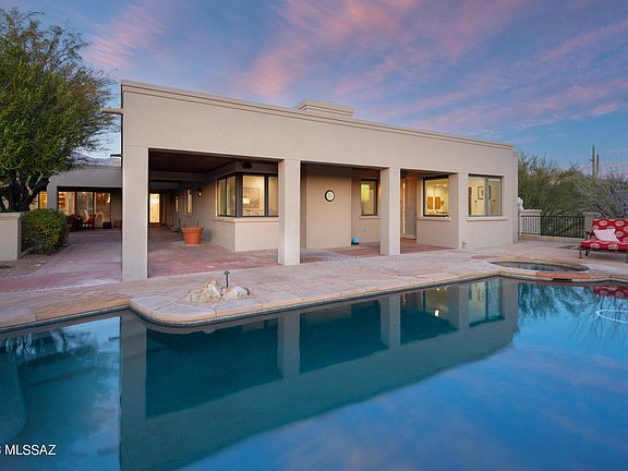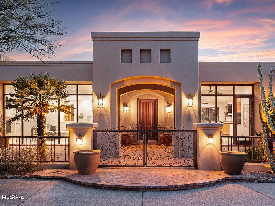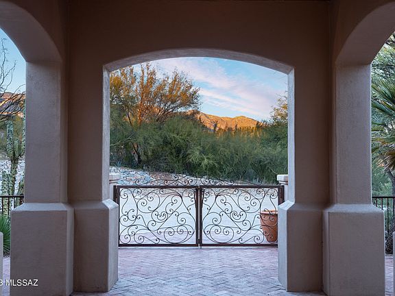 Located in exclusive, guard-gated Catalina Foothills Estates #10 in the heart of the foothills, this one-level Michael Franks, masonry-constructed luxury desert residence on a 1.6-acre homesite delivers true privacy, views, & an exceptional architectural presence. A long driveway leads you to a sizable, exposed aggregate motor court & the front courtyard w/ a custom iron gate, an impressive portico entry, & a red brick patio area. A dramatic entry w/ a soaring wood-beamed ceiling is centered between the formal living/dining area & the kitchen/family area. This open space, complimented by walls of wood-framed windows, flows effortlessly between the casual & formal spaces w/ direct access to the wraparound covered patio & backyard, merging the indoor and outdoor spaces.CONTINUED The formal living room with fireplace is adjacent to the spacious formal dining area, and the temperature controlled 2000+ bottle wine room. The kitchen, with custom cabinets and granite countertops, has a center island with a breakfast bar and a big walk-in pantry. An informal dining area/breakfast nook opens to the cozy family room with a fireplace and custom built-ins. Truly impressive; spacious primary suite with fireplace has views and privacy. The huge primary bath with a dual sink vanity, separate shower, and soaking tub has an oversized closet with built-ins. French door leads to backyard pool and spa. The private, secluded resort-style backyard with pool and spa is surrounded by the beauty of the desert and showcases the remarkable Tucson sunsets. The nearly 1100 square feet of deep, covered patio with wood ceilings wraps around the back of the home, providing outdoor living and dining space. Desirable north/south orientation. Oversized 3-car garage is 1116 square feet and has built-in storage cabinets and an additional storage closet. This prime foothills location is convenient to the best golf courses, country clubs, restaurants, shopping, the University of Arizona, and downtown. Quickly access the Rillito River Path and access the Loop, a 133-mile connected bike path that spans the city. Highly rated District #16 schools.