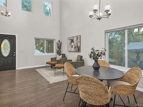 Amazing updated home in the Park View Meadows neighborhood. Step inside to a front room boasting soaring ceilings, complemented by a view of the loft above and elegant hardwood flooring that extends through the main level. Entertain in the dedicated dining space, perfect for formal gatherings, or delight in the recently revamped kitchen, equipped with a center island, casual dining area, stainless steal appliances, and sliding doors leading to an expansive covered patio. An added stamped concrete patio and fire pit beckon for outdoor relaxation. The living room, centered around a warm fireplace, invites relaxation. Upstairs, plush new carpeting leads the way. The upstairs hall bath has been fully remolded, the loft area is versatile and ideal for a home office. Retreat to the primary bedroom, a sanctuary of space highlighted by vaulted ceilings and an updated ensuite bathroom with a sliding barn door. Dive into entertainment or unwind in the spacious family room nestled in the basement. Attached two-car garage, a new water heater, new furnace, new AC, Anderson windows recently installed, and the exterior has been recently painted, ensuring lasting curb appeal. The adjustable app controlled JellyFish Lighting around the exterior of the home gives you fantastic curb appeal! Great location in the Cherry Creek School district, walking distance from Eaglecrest High and Thunder Ridge Middle School. Welcome to your next chapter in this remarkable residence.