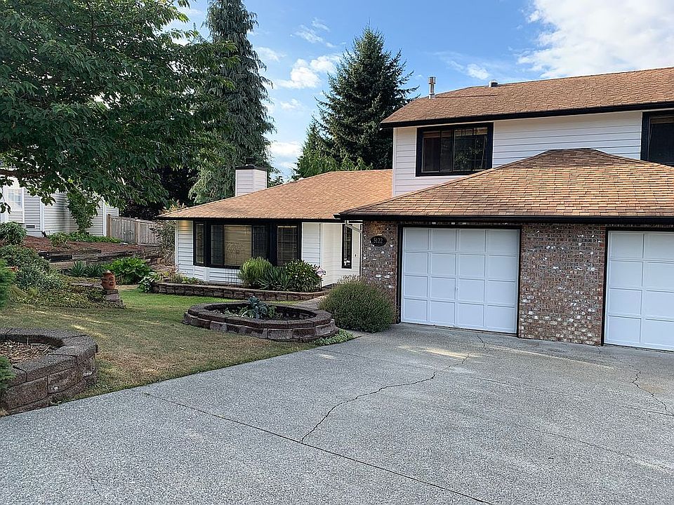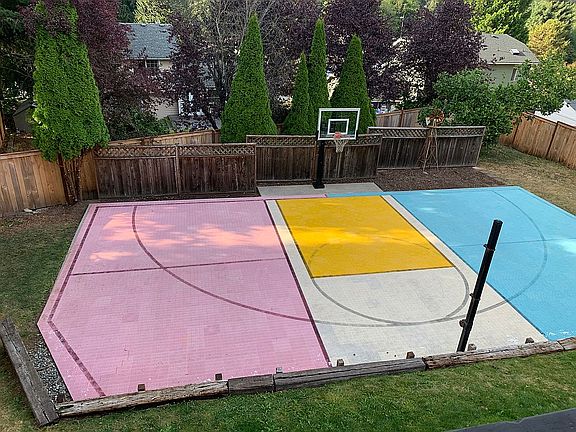 Open concept; 2 master bedrooms; 3 decks; deck one is a large covered tile deck; sport court; finished garage.
