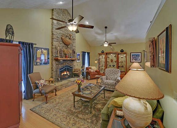 Rare opportunity to make your new home in one of the most sought-after HOA developments - Pine Crest. Three bedroom/4 bath English cottage style property has all the extras - stone-faced wood-burning fireplace (can be re-converted to gas), vaulted ceilings in Living Room and formal dining room, decorator paint colors, all new light and ceiling fan fixtures, remodeled kitchen with granite counters, abundant cabinetry and stainless appliances. Generous-sized laundry room on Main Level adds to overall living convenience. Enclosed multi-windowed sun room opens onto covered deck. Hydraulic elevator makes stair climbing a thing of the past. New Carrier HVAC system installed in March 2024. Downstairs is fully finished offering separate heating system, full bath, bedroom, and large common room. Eat-in or entertainment bar offers additional owner options. Separate entrance and stone patio overlooking the expansive lawn. Storage, storage, storage! Large storage and separate shop room complete the benefits of this additional space. Mature, low maintenance perennial and shrub gardens further enhance owner enjoyment without tedious upkeep.