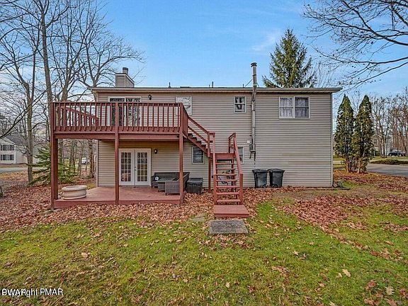 Stunning 4 Bedroom, 3 Bathroom, Short Term Rental Friendly home located in Low-Fee Pocono Farms East! The main floor boasts gleaming hardwood floors throughout, an open floor plan seamlessly connecting the living, dining room, & kitchen areas, an updated kitchen w/quartz countertops, SS appliances, a subway tile backsplash, SS farmhouse sink, skylight, & recessed lighting, a Primary Bedroom Suite which includes a stylish bathroom w/a full tile shower, 2 additional bedrooms & another full bathroom. The lower level features an additional bedroom, bathroom w/ tile floor & subway tile shower, laundry room, and a family room with a fireplace & French doors leading to the lower tier deck, creating a perfect space for relaxation. Flat yard, 1 car garage, Low HOA dues and Low Taxes!