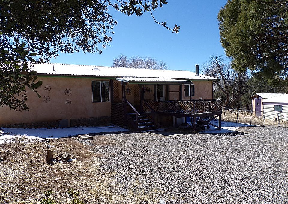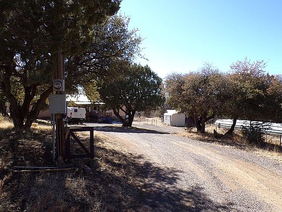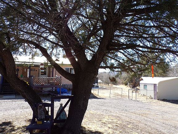 Level homestead, stuccoed and on permanent stone foundation. Artists home full of color on 1.37 Acres with seasonal creek. Circular drive with Views, large Alligator, and other Juniper trees and a Momma Cottonwood on corner of property. Many out-buildings, including a 2 car garage/shop/studio, a carport, 3 sheds, 1 big metal bldg for garage or workshop. 1/2 of property fenced, for animals,- dogs or livestock. RV parking/ 30 amp hookup. 2 porches, laundry room, a 360sq addition of 3 rooms on south side with passive solar warmth, one is the enclosed porch, 2 others can be an office, exercise room, or a 3rd BR.. Master has side entrance w new deck, great for separate rental/airbnb,/motherinlaw. 3 miles to town, on City Water plus has a registered well with new pressure tank. 1 yrs old new septic system. Fruit trees, cactus garden, tiny 'tea-house' outside the back enclosed porch. 1 1/2 miles to Gomez and the Gila National Forest. There's a LOT here to Like! Tons of possibilities!! Stars Galore!