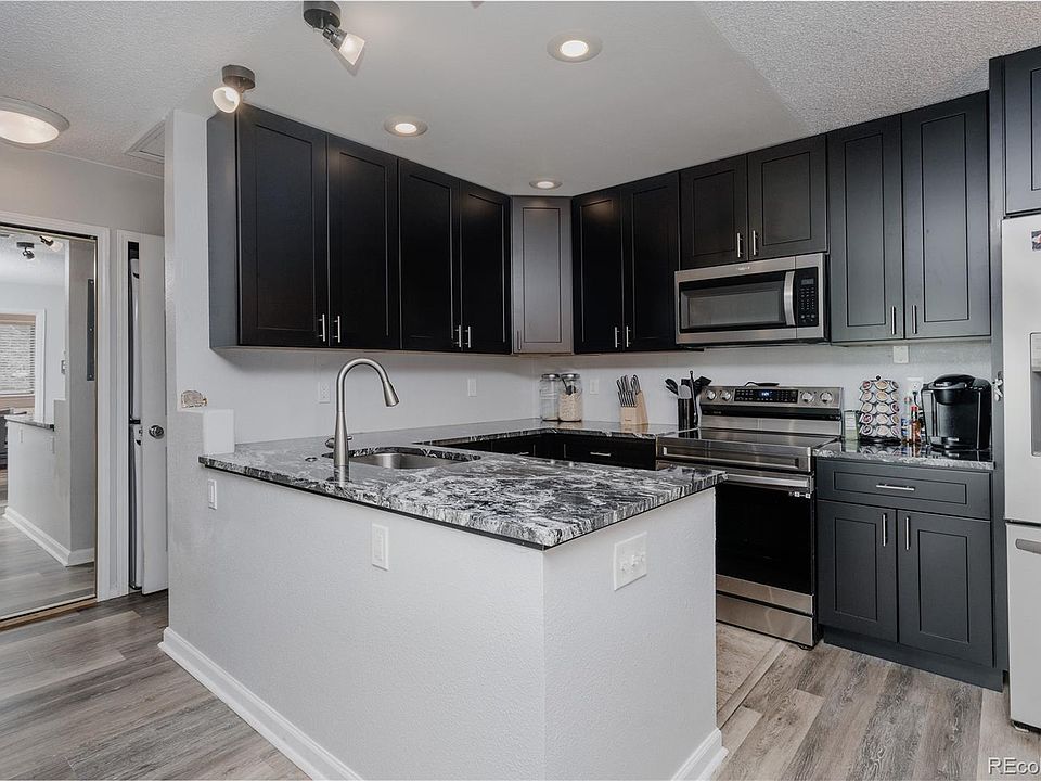 Welcome to Spanish Oaks, where classic design meets modern convenience! This beautifully updated split-level condo offers vaulted ceilings with recently cased skylights, an open floor plan, and a private deck, ideal for morning coffee or evening relaxation. The newly remodeled kitchen features brand-new soft-close cabinets, granite countertops, stainless steel appliances, and a cozy dining area. The spacious primary suite includes ample closet space and an en-suite bath, while the den provides a versatile space for an office, reading nook, or nonconforming second bedroom. Recent updates include newer flooring, light fixtures, AC, electrical, and hot water tank, providing both style and peace of mind. The open living and dining areas flow seamlessly, creating a bright, welcoming atmosphere perfect for entertaining or everyday living. Enjoy all the amenities of the sought-after Spanish Oaks community, including a pool, spa, and beautifully landscaped grounds. Conveniently located near shopping, dining, and entertainment, this condo offers both comfort and convenience in a desirable setting. Hurry and schedule a showing today!