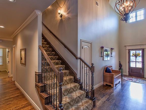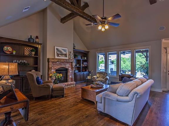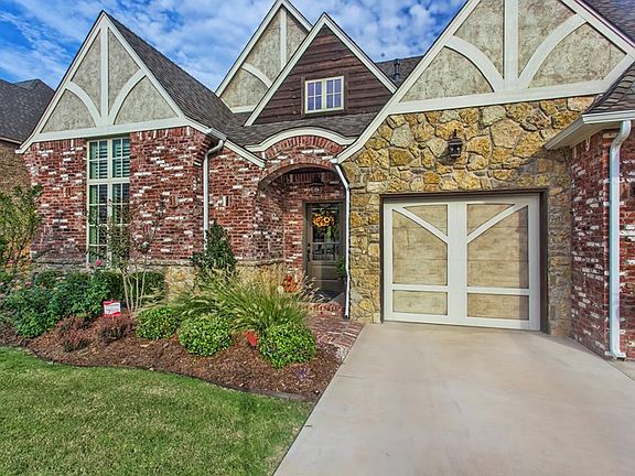 Gorgeous custom with so many wonderful upgrades in one of Edmond's upscale neighborhoods! Open Entry with stairs outlined with iron railing. Spacious kitchen w/granite, beautiful distressed painted wood kitchen cabinets, stainless steel appliances, tons of storage, breakfast area built-ins, and gas range top. Formal dining room with arched ceiling - very dramatic! Large master suite with sitting room and coffee bar off master bedroom, oversized master bathroom has integrated TV behind vanity mirror, huge shower with rain shower head. A guest bedroom downstairs with a private bathroom and a private study downstairs. Plantation Shutters in Master Bedroom and Study. Family room with fireplace and custom built-ins, beams in ceiling. Upstairs bonus room and two wonderful bedrooms! Drum roll please.....NEW in-ground saltwater pool w/Easy Touch Remote System, this gorgeous backyard has an outdoor living area with fireplace and gas grill and overlooks a private wooded area.