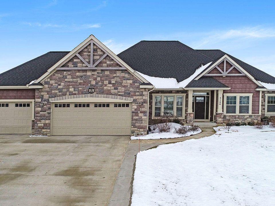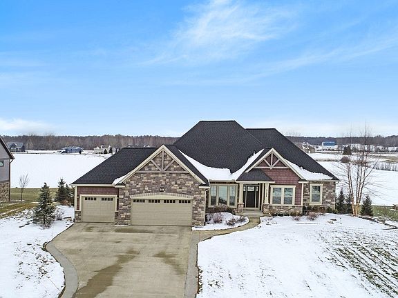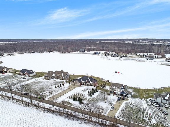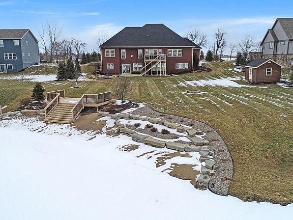 Executive ranch home on a private all sports lake! From the foyer, you're greeted by a fireplace in the spacious living room, a formal dining room, and French doors leading into an elegant office. The master suite is located on the opposite end of the home from the other bedrooms. Walking into the gourmet kitchen, your attention is drawn to the beautiful ceiling beams and quartz countertops, which are accented by granite on the large island. The walkout basement is fully finished with a large recreation room and a kitchenette making it perfect for those summer lake days. The large backyard leads up to over 100 feet of lake frontage with your very own sandy beach. Other features of this home include a whole house generator, in-duct air purifier, and a deep garage to fit full size pick-ups.