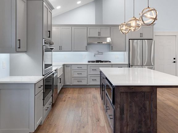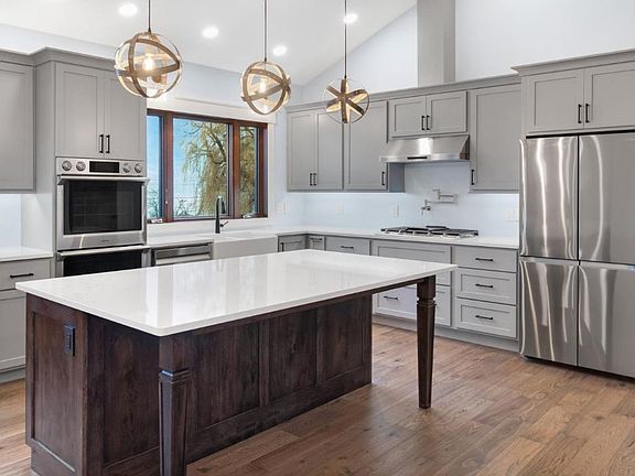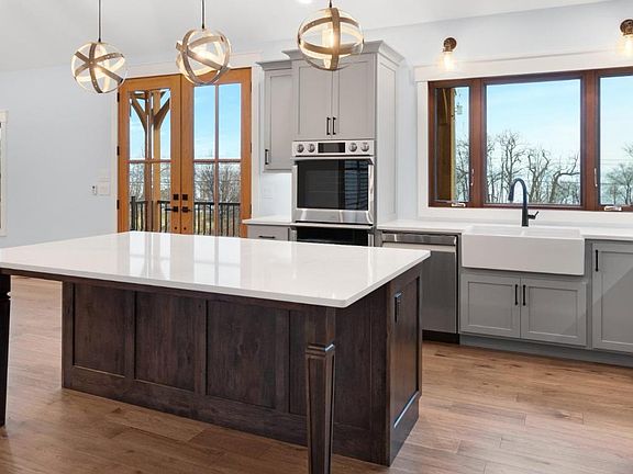 Though constructed with wood and stone, this home was built and designed as a true labor of love. Every detail was considered, not one overlooked. You'll find yourself in awe with the 15' cathedral ceilings in the open concept living areas. Custom finishes in every cabinet and vanity, engineered hardwood floor and tile choices, light fixtures, quartz and butcher block countertops and the 8' grand entry doors. This gourmet kitchen is fully equipped with top of the line stainless steel appliances, gas stove top, pot filler and a large white farmhouse sink situated perfectly under the oversized windows offering that stunning lake view. Get lost in the primary suite with a generous closet, and the most beautiful tiled bathroom with a dual head walk in shower, double vanity and soaker tub. The private laundry, pantry and wet bar are just one more wow factor to this home. Fully unfinished walkout basement, will double your living space, already prepped for bath & kitchenette.