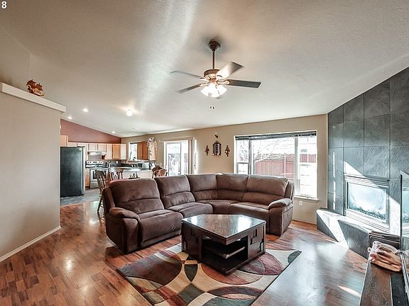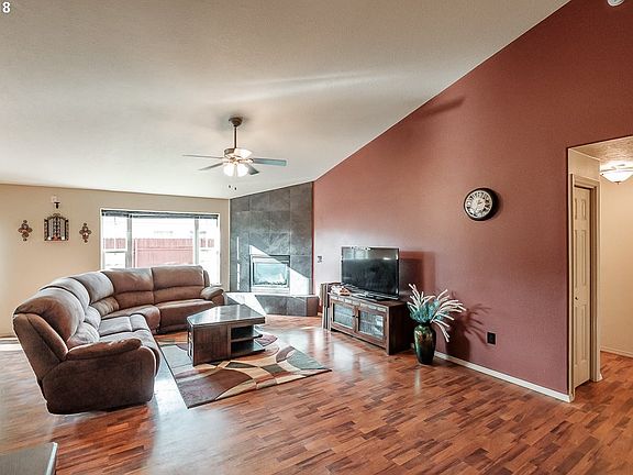 Open floorplan with vaulted ceilings, laminate flooring in main living areas & bedrooms, Italian tile floor in kitchen, gas fireplace in living room with ceiling fan, and oversized sliding door to brand new composite deck. 84' RV pad and fully fenced.