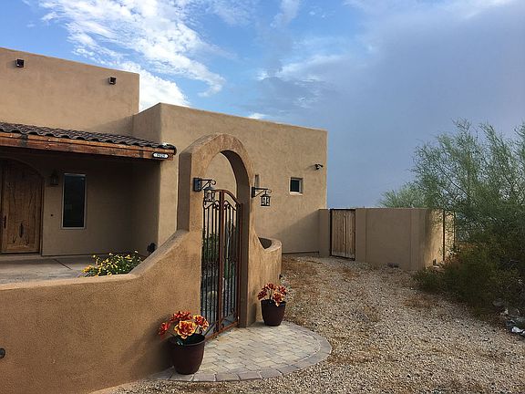 HORSE PROPERTY ON 2.5 ACRES! Enjoy the rural atmosphere with city conveniences. 360 degree views of the Cave Creek hills and sprawling landscape to the south. Set up as horse property with 4 stalls & self-water, 130x80 arena, 12x20 tack shed. Ride off the property straight to some the best trail riding in Arizona! If horses aren't your thing then the arena area is perfect for your future workshop, guest house, etc. Custom home boasts stamped, wood look, concrete floors; custom Mesquite double front door; 2 fireplaces; custom knotty Alder cabinets; copper sinks; SubZero R/F; 2nd & 3rd bedrooms share Jack-n-Jill bathroom; covered back porch; roof top deck; covered outdoor BBQ with concrete countertops, live-edge bar top, & Traeger Grill/Smoker; & built-in firepit to gather around.