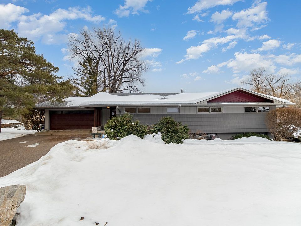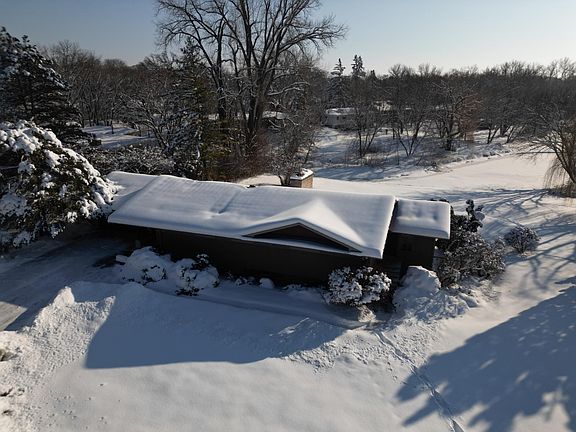 RARE FIND—3,621 finished sq. ft. mid-century modern rambler in a park-like setting located on a cul-de-sac backing up to Bassett Creek on a .8 acre lot. Main floor features 3 bedrooms; 2 bathrooms; large living room; 2-sided stone fireplace; four season porch, and a completely renovated kitchen in 2022. Kitchen features: white kitchen cabinets ; subway tile backsplash; quartz counters; stainless steel appliances; a breakfast bar that seats 3; and trendy new lighting. LVP wood floors in front entry, bathroom, kitchen and dining area. Heated floors in main floor bathroom and throughout entire lower level. Walk-out basement features a family room with a fire place, Built-in bar, dry sink and granite counter. Architecturally unique accent lighting runs along walls and beamed ceiling in family room. Stamped outdoor patio positioned next to a wood burning fire place and built-in charcoal grill with a magnificent stone surround. Home exterior newly painted in 2022. New roof in 2021.