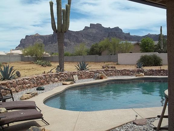 Single Family - Detached, Spanish - Apache Junction, AZ MOUNTAIN VIEWS ARE INCREDIBLE!! EVERY ROOM IS GINORMOUS! PLENTY OF SPACE FOR YOUR FAMILY AND FRIENDS. ALL ROOMS HAVE easy to care for WIDE PLANK TILE (NEW 2014)NO CARPET! BOASTS 2 beautiful fireplaces (1 in Master)Second bedroom is very big and has two ceiling fans. ALSO has a gas fire pit in HUGE GINORMOUS backyard that is completely fenced with a block wall. 10 FT Diving pool is pebble tech and self cleaning (new 2012)Horses are allowed and Just minutes to Superstition hiking and Lakes. If you are looking for that special property with gorgeous views then this is THE place to call HOME! TAKE A LOOK AND YOU WILL BE MOVING IN!