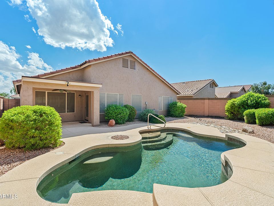 The spacious primary suite includes a walk in closet, dual sinks, limestone topped vanity, and a tile surround shower. Two additional bedrooms and a flexible den provide plenty of room for family, guests, or a home office. Outside, your private retreat awaits. A sparkling pebble finish pool, covered dining patio, and mature low maintenance landscaping set the stage for effortless outdoor living year round.