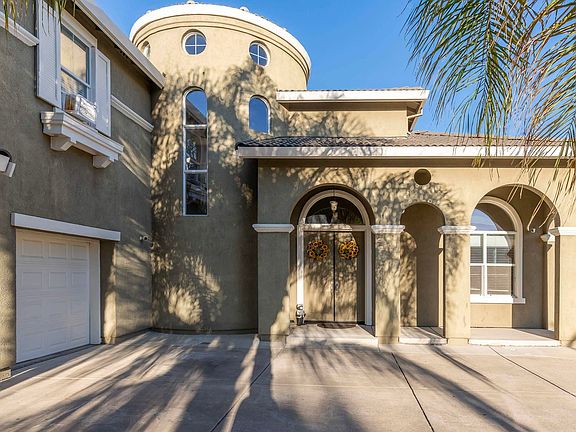 This stunning 5-bedroom, 3-bath home in Black Diamond Canyon is ideal for a large household or anyone who loves to entertain and host out-of-town guests. Graceful palms and arches draw your attention upward to a central cupola with circular windows, promising space, light, and luxury. Inside, tile floors, high ceilings, and generous windows with half-moon clerestories flood the living areas with natural light. A curving staircase with iron railings and hardwood risers winds to the upper floor. In addition to the open kitchen and living area with gas fire, the lower level encompasses a dining room, a den with a bar, and a private bedroom with full bath—perfect for guests. The kitchen features natural stone counters, an artful tile backsplash, breakfast bar, and stainless appliances. An additional breakfast nook faces wide windows with a view of the backyard. The primary suite upstairs has a sitting room with its own gas fireplace and an en suite with a glassed-in shower and freestanding tub. Floors on the upper level are hardwood, and fixtures in both baths are spa quality. An expansive backyard features a raised deck above the pool area and a patio with space for grilling, dining, large parties, or simply relaxing in the sun. Terraced, drought-resistant landscaping.