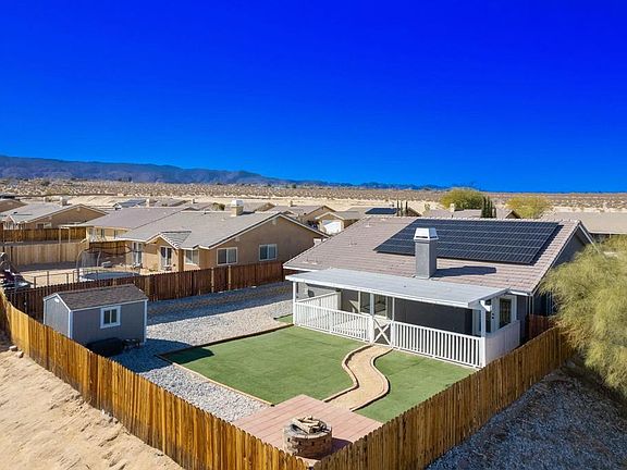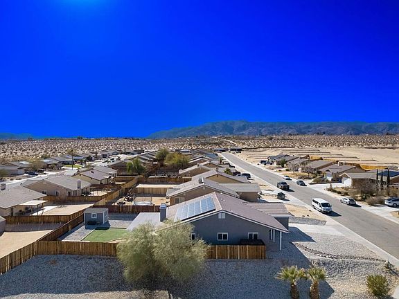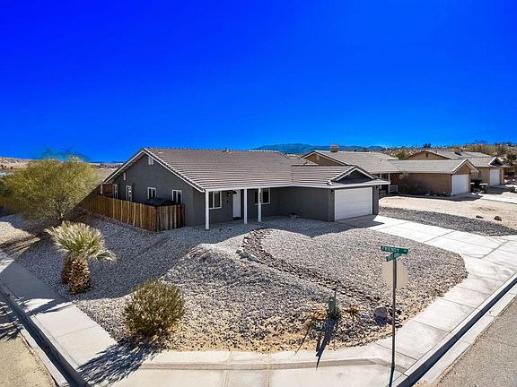 Come check out this beautiful corner lot home in a quiet neighborhood in Twentynine Palms. This home has been well taken care of by its owners. They put astroturf in the backyard and there is loose rock in the front yard. The side yard is gated off for a family pet.It is updated to current trends with its color scheme of greys and blues. There are solar panels that's ownership will transfer to the next buyers. The HOA ensures that the neighborhood remain desirable. This location is ideal for military families that need to be close to the base for work but want a space of their own. It is only 5 minutes from the gate! Twentynine Palms is the neighboring town from the world-famous Joshua Tree. If you love to hike, camp, or off road, this home is perfect for you to be conveniently located near all of those opportunities.